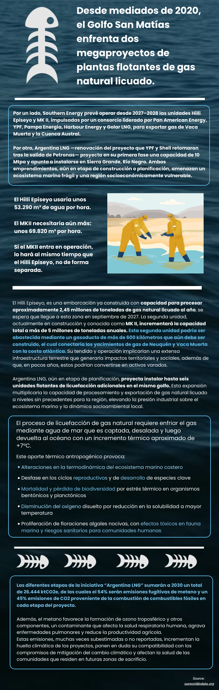Argentina LNG retoma una idea previa de construir una planta onshore en alianza con Petronas, pero luego fue reformulado para apostar por más unidades flotantes. Se trata de un megaproyecto con alto impacto en el ambiente marino, la salud y la dinámica costera, con escasa transparencia sobre sus costos y beneficios reales.
