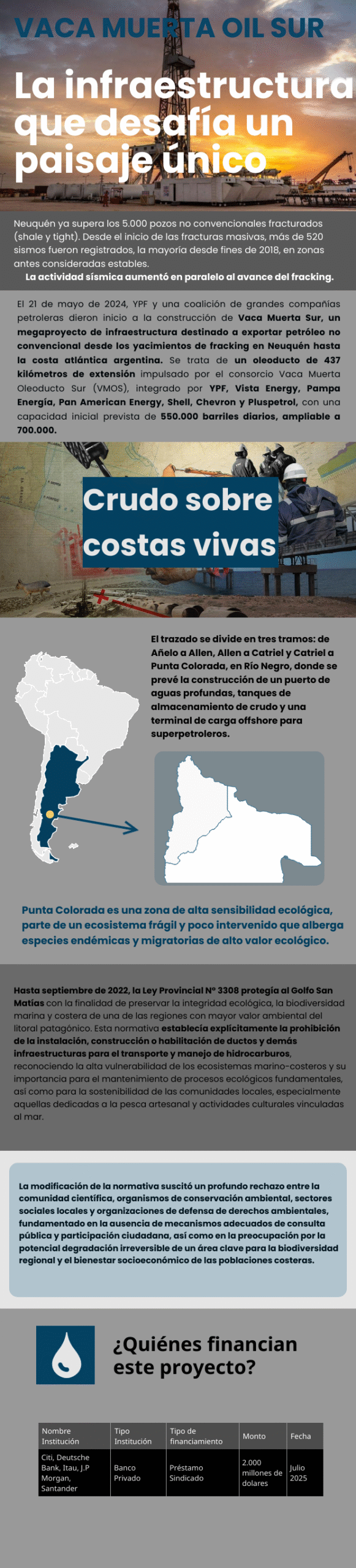 Este proyecto fue aprobado por tramos, con evaluaciones ambientales parciales que impidieron un análisis integral de sus impactos. En su fase final, busca exportar hasta 700.000 barriles diarios, el equivalente a casi toda la producción nacional de crudo en 2024. Las obras ya comenzaron, a pesar de que la infraestructura portuaria aún no cuenta con aprobación final.